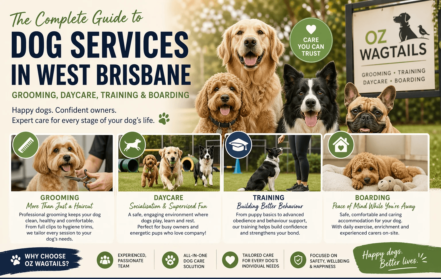 At Oz Wagtails, we know that every dog is unique—so here’s your complete guide to navigating the essential dog services available across Brisbane’s western suburbs.